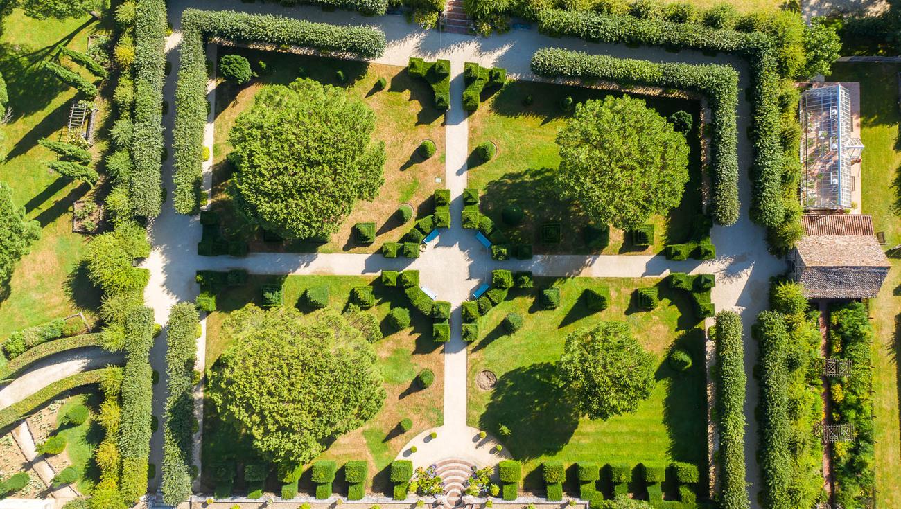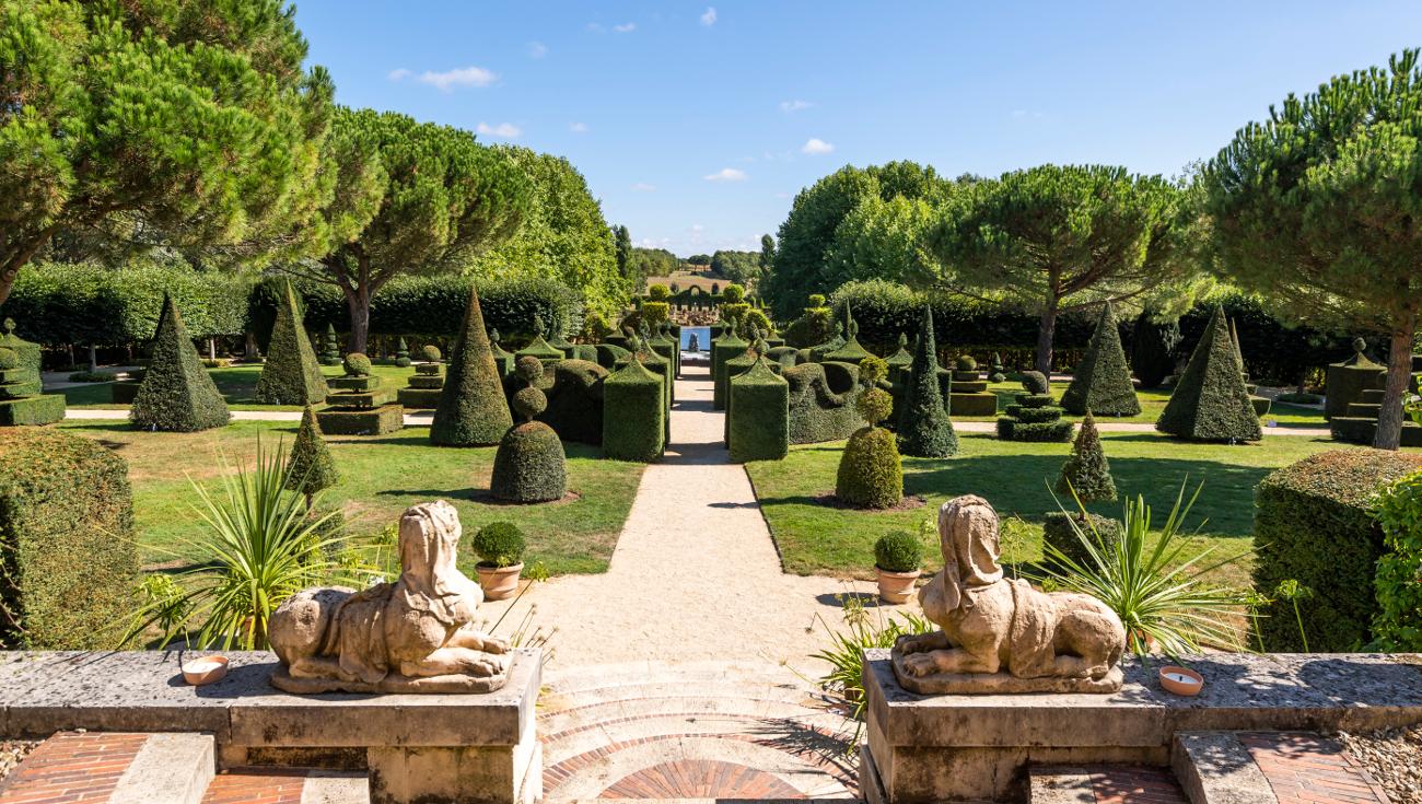 Stone, vegetation, water, and sky: from the long terrace adjoining the house, the gaze takes in this spectacular view. Like the sphinxes that frame the stairs, the visitor looks out over a parterre further down, its insolent green stretching back towards the vanishing point on the hill and its enigmatic cave.